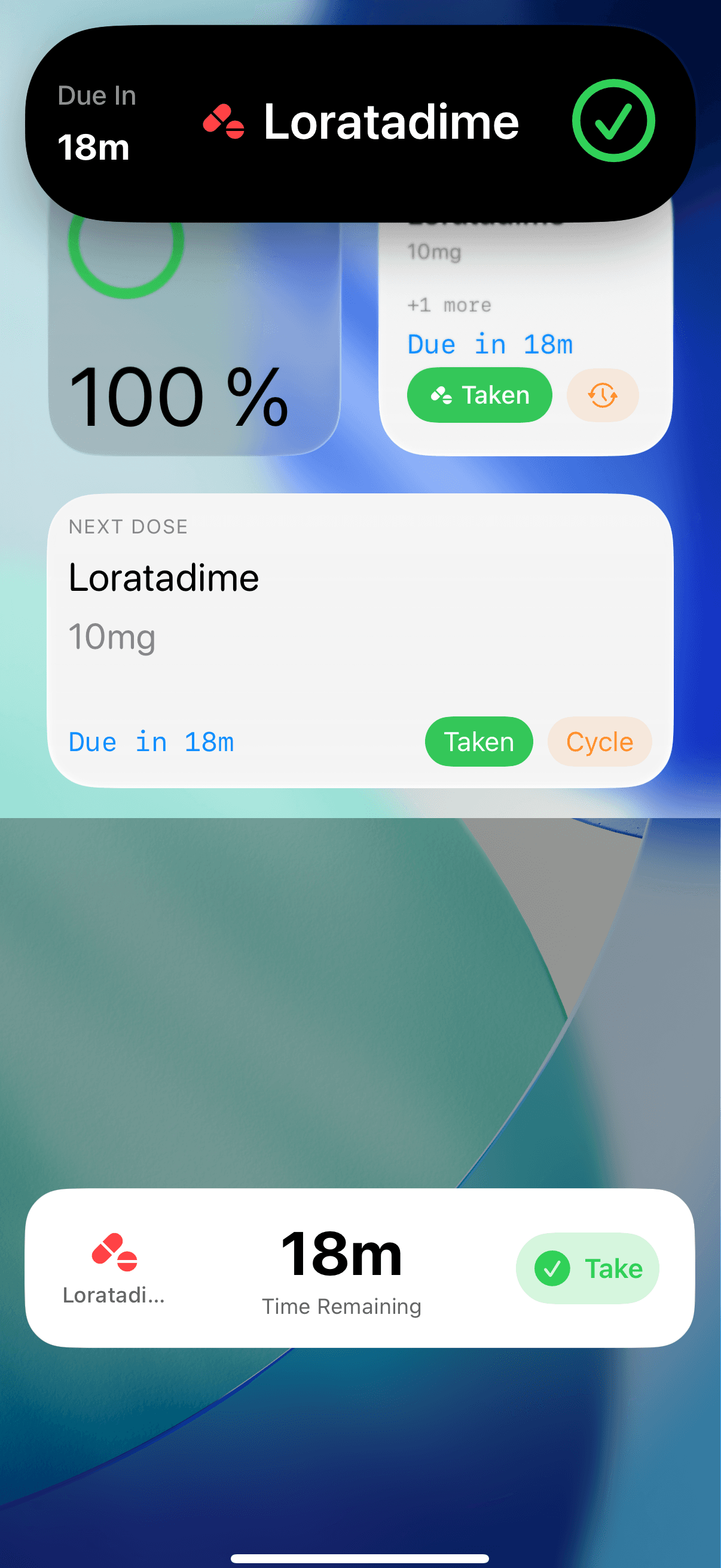 See when your next dose is due directly on your Dynamic Island. Get gentle reminders before it's time, and mark doses taken instantly—even when your phone is locked.